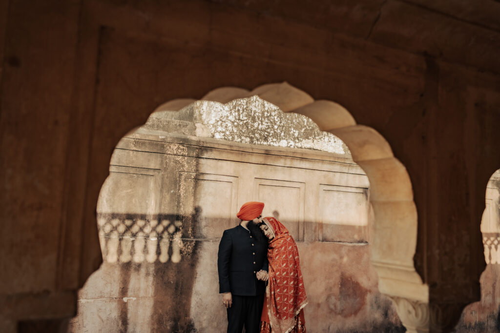 A couple posing for a pre-wedding shoot in Jaipur, framed by a traditional stone archway at a historic fort. The groom wears a black bandhgala and orange turban, and the bride is in a red traditional outfit.